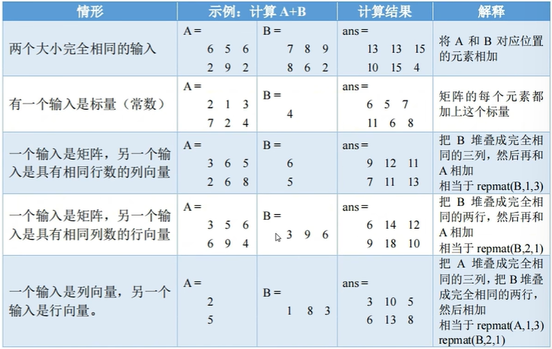 与线性代数知识稍有不同,MATLAB 中矩阵加减运算不需要参与运算的两矩阵大小完全相同。而是符合 MATLAB 矩阵算术运算的五种兼容模式即可。如下图所示: