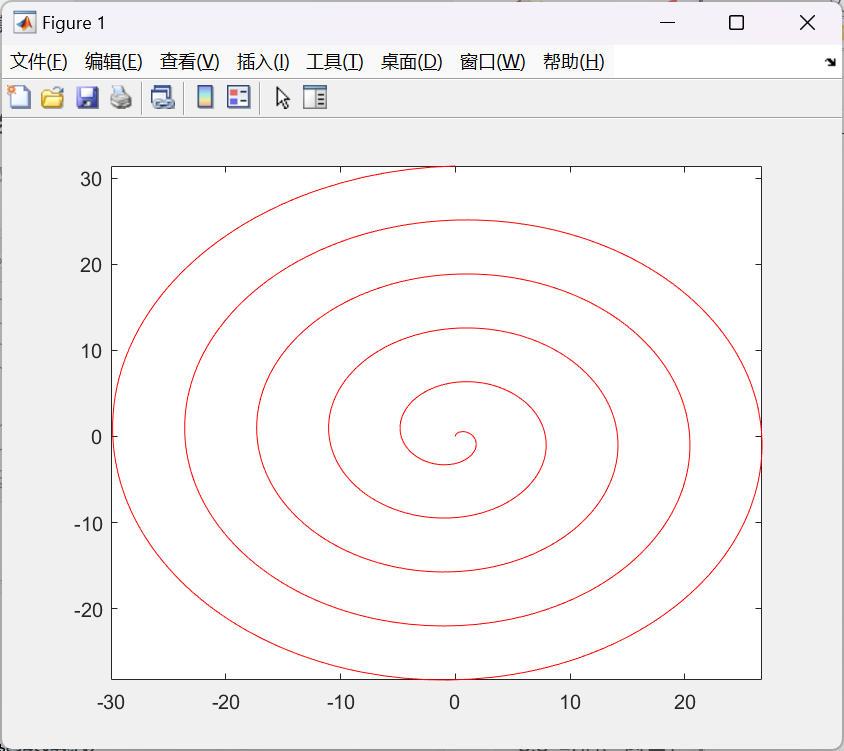 fplot(@(t)t.*sin(t),@(t)t.*cos(t),[0,10*pi],'-r'); |