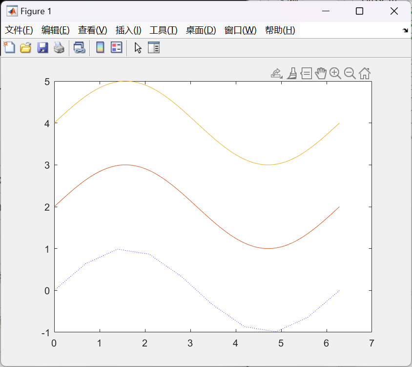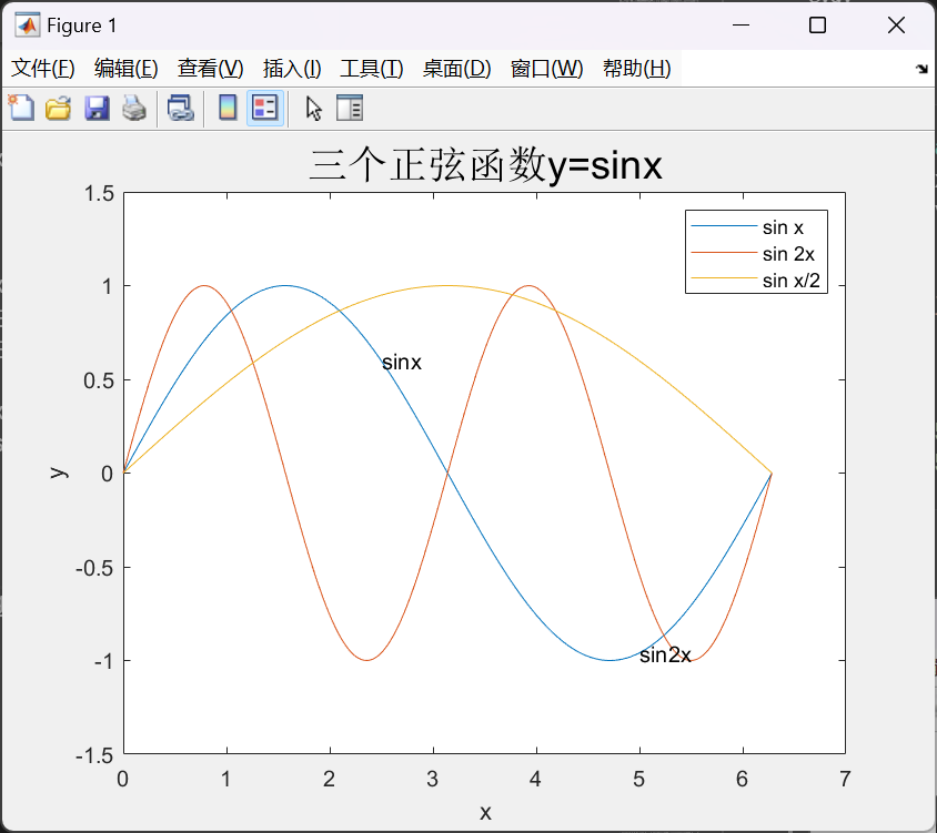 title("三个正弦函数y=sin{x}","FontSize",18); % 标题 | |